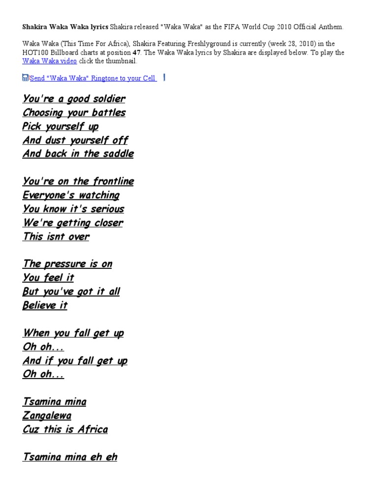 Waka Waka Lyrics Shakira This Time For Africa The Official 2010 Fifa World Cup Team Song