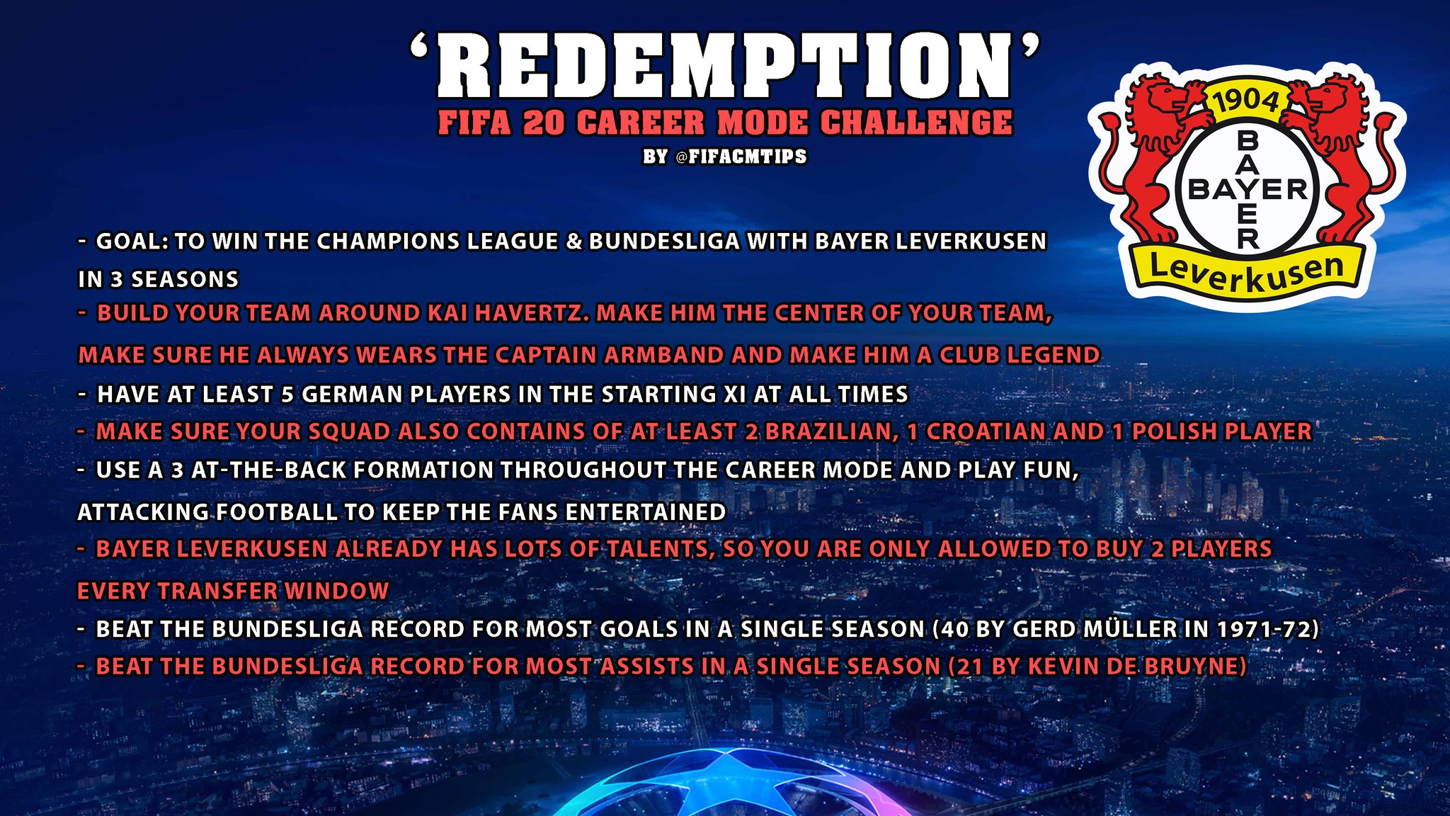 Fifacmtips On Twitter Redemption Fifa20 Career Mode Challenge Create A Champions League And Bundesliga Winning Side Around Kai Havertz And Turn Bayer04 En Into A Dominant European Force Have Some